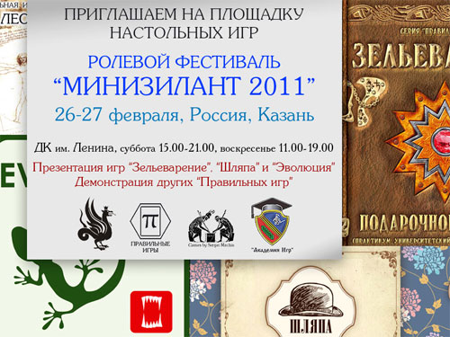 В эти выходные в Казани пройдёт ролевой конвент МиниЗилант — 2011, в рамках которого будет проведена площадка настольных игр. Мероприятие состоится по адресу: Россия, г. Казань, ДК Ленина. В субботу фестиваль работает с 15.00 до 21.00. В воскресение — с 11.00 до 19.00. Посетить фестиваль приглашаются все желающие, денег за участие не берут.