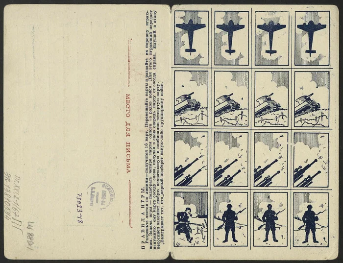 Случайно попались на глаза почтовые открытки времён Великой Отечественной войны. Оказывается, на них тогда печатали настолки, чтобы бойцы могли скоротать свободное время. Игры, понятно дело, были в основном традиционные — шахматы, шашки, домино. Но кое-что необычное тоже попадалось.