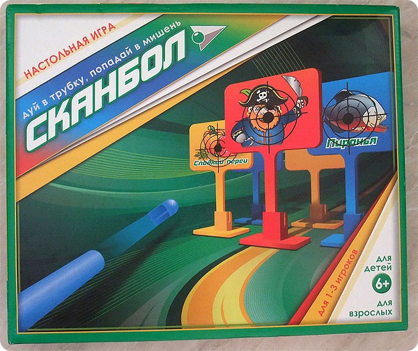 Наконец, Сканбол. Российская настольная игра, которая, однако, скорее относится к настольным игрушкам, а не играм. Смотрите сами — в комплект входят несколько мишеней, в которые нужно плевать из трубочки специальными снарядами, словно индейцы или ниндзя, пользующиеся духовыми трубками. Предоставлена игра компанией "Сканбол".