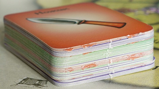 Красные карты («ножики») имеют здоровенную бахрому по коротким краям, а ведь в игре есть момент — об этом ниже — когда нужно угадывать тип положенной втёмную карты! И этим косяки не исчерпываются — вот здесь можно видеть фотографии экземпляра игры, где съехали цвета на жетонах.