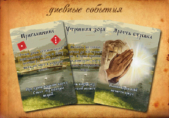 В картах событий указывается, что Вы должны делать. Это может быть атака противника, приобретение каких либо вещей, которые потребуются для того или другого. Так же есть вид карт, который дает возможность сбросить карту из руки противника.
