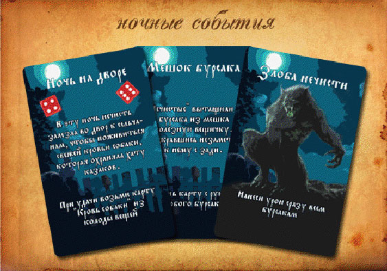 В ходе игры происходят разные события, в каждой фазе игроки берут соответствующие карты событий, которые нужно разыгрывать. На некоторых картах присутствуют цитаты из произведения «Вий», что придает мистическую атмосферу и максимальное погружение в игру. На определенных типах карт, изображены игральные кости со значениями. При проверки действий, игрок должен выкинуть указанное значение на карте и тем самым, «удачно» отыграть действие.