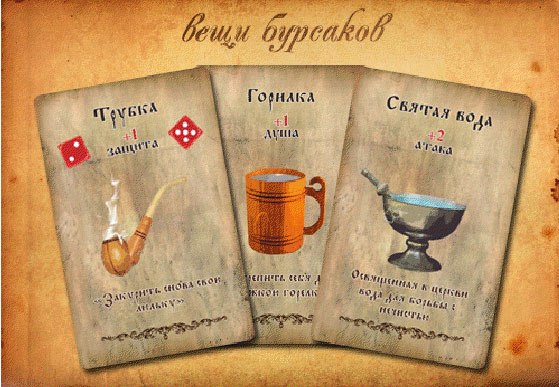 Защищаться придется не реже чем и биться. Для этого у бурсаков имеется разнообразный арсенал предметов защиты. Чтобы нечисть не нанесла урон, можно вокруг себя очертить мелом круг, тем самым отразить атаку. Можно воспользоваться молитвенником и нательным крестиком, как истинному православному человеку. Но это далеко не все…