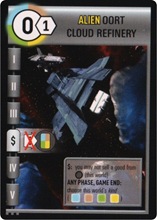 А вторая карта — это не что иное, как самая настоящая Звезда Смерти! 🙂 Работает как захват, только не захватывает миры, а тупо уничтожает их со стола. И даёт 2 ГП, если дело выгорело. Да ещё и +3 к военной мощи, и 1 ГП при розыгрыше. И 9 (прописью — девять) ПО в конце игры. Правда, чтобы такое разыграть, придётся нехило напрячься. 🙂 Из-за этого даже заменили одну карту базовой колоды («Galactic Federation», которая раньше предполагала, что технологий дороже чем 6 в игре нет).