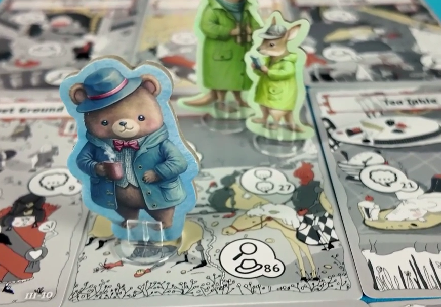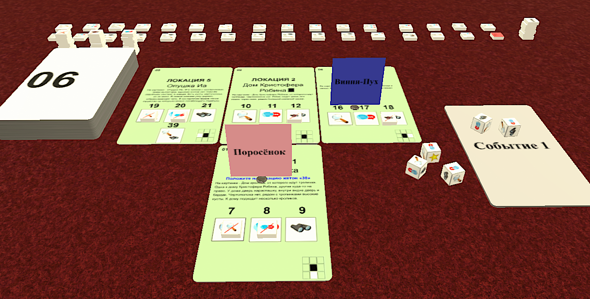 Как я уже писал выше, основные виды взаимодействия в игре — это наблюдение, разговор и обыск. По контексту игрок может догадаться, к чему приведёт тот или иной тип взаимодействия. В начале своего хода он взвешивает все за и против, мысленно распределяет доступные ему кубики (тут самое время посовещаться с друзьями) и приступает к выполнению своего первого действия. Игрок выбирает точку интереса, закрывает её жетоном и вытаскивает из колоды дела карту с соответствующим номером. На ней есть текст с ценной информацией, а также иллюстрация, которая может оказаться частью головоломки. Так игроки тратят свои символы и передают ходы, пока не раскроют дело или не истечёт время партии, отмеряемое картами событий. В конце команду сыщиков ждёт одна из нескольких заготовленных развязок. Она зависит от выполнения основного и побочных сюжетных заданий. Чтобы полностью провалиться, надо в плохом смысле слова постараться, а чтобы получить наилучшую концовку — внимательно вчитываться в художественные тексты и максимально эффективно использовать ресурсы. Горько-сладкие концовки в Винни-пухе тоже есть, так что в результате игроки в любом случае получат цельную историю в награду, а не подсчёт победных очков и таблицу с системой оценки.