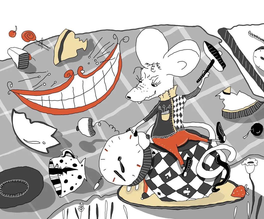 Разработка — итеративный процесс. Прототип должен пережить множество тестов и изменений, прежде чем доберётся до массового издания. И путь, который мы для этого выбрали, оказался не самым простым. У каждого сценария свой стиль. Акварель хорошо подошла Стоакровому лесу. Гротескные старые комиксы добавили брутальности рыцарям Камелота (и позволили сыграть на контрастах с характерами некоторых из них). Чёрно-белые картинки с редкими цветными вкраплениями и нарочито неаккуратными линиями подчеркнули лёгкое безумие Страны Чудес и Зазеркалья. Но сколько же времени и сил отнял такой подход… Особенно когда приходилось возвращаться к уже готовым иллюстрациям, чтобы перерисовать их из-за новых правок в сюжете.
