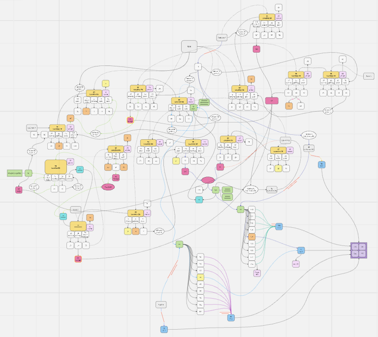 В каждом из сценариев Винни-Пуха есть основные и побочные сюжетные задания, выполнение которых влияет на концовку. У персонажей собственные сюжетные арки, и весь мир живёт своей жизнью параллельно расследованию. Время в игре отмеряется картами событий, от них зависит состояние мира, доступные локации и точки интереса. Всё связано со всем. Чтобы сбалансировать и отладить этот механизм, наша команда строила разветвлённые блок-схемы для каждой итерации каждого сценария. Зато теперь мы уверены, что в игре нет неправильной последовательности действий, при которой она сломается, и из открытых карт, в каком бы порядке вы их ни брали, складывается книжное повествование.