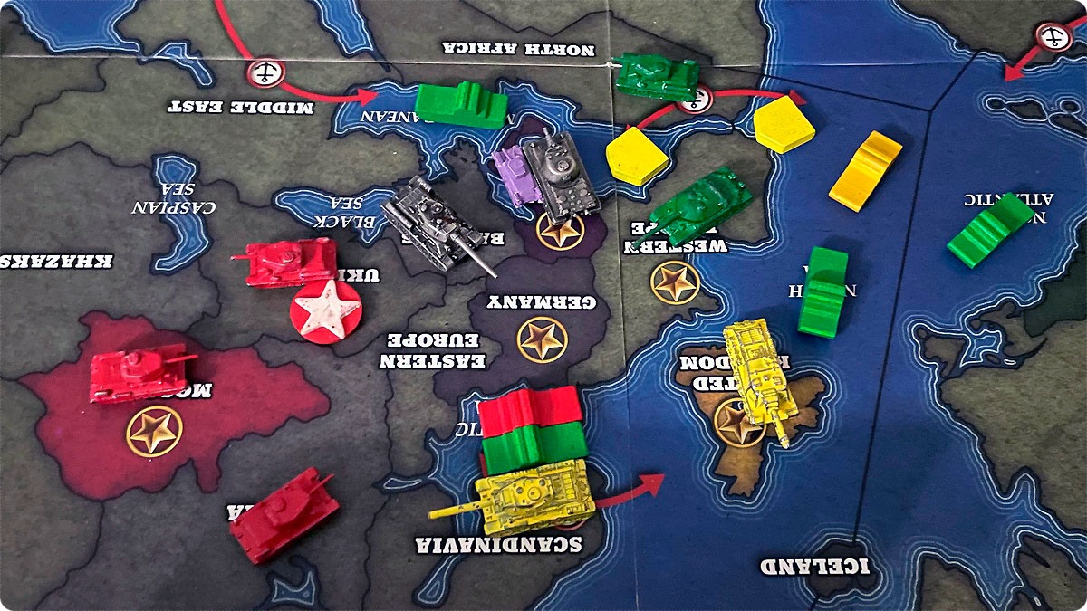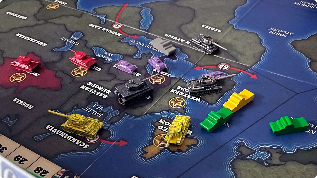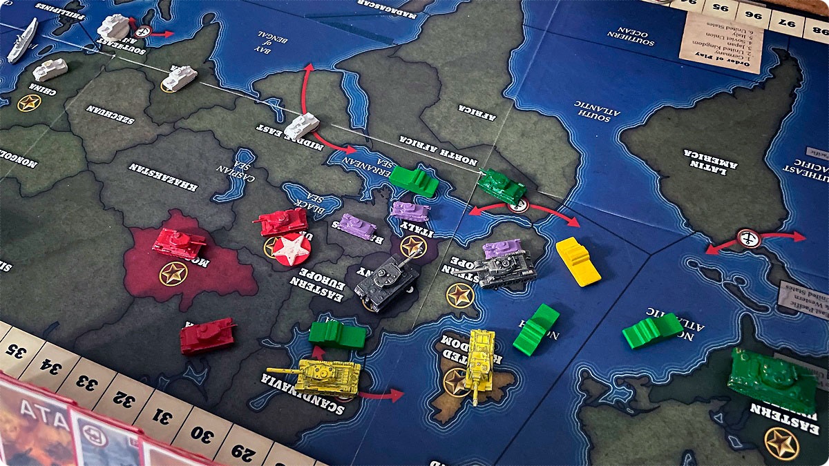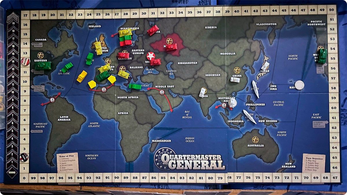 И тут началась гонка. С одной стороны команда Оси получала больше очков и успела убежать на счётчике где-то на 20 позиций вперёд. С другой стороны у Союзников получилось переломить темп войны в Европе. И тут были ещё пара моментов. Первое, у Союзников заканчивались карты в колодах. Второе – на счётчике ходов заканчивались ходы.