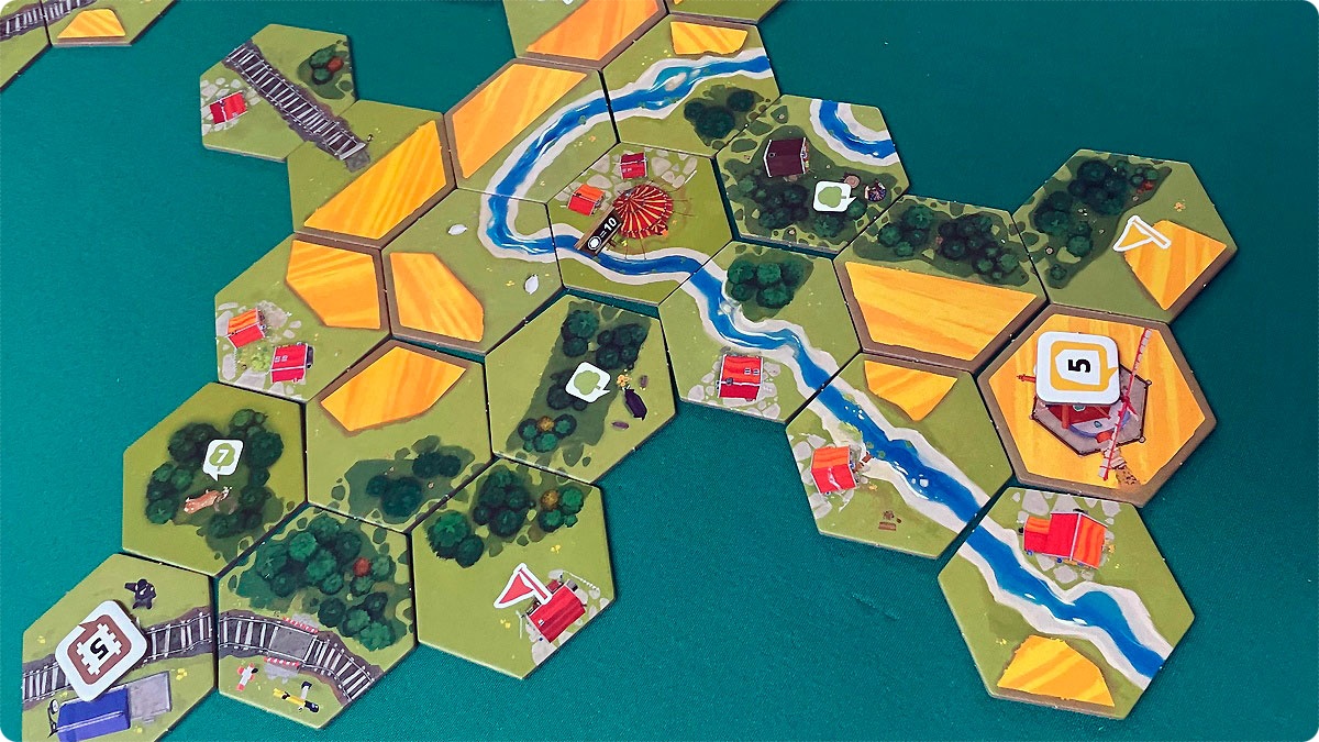 В Dorfromantik была попытка устроить семейную партию, привлекли за стол ещё дочку и бабушку. Сыграть – сыграли, но не особо удачно. Дочка процессом особо не заинтересовалась. Всё же, видимо, собирание вот этих вот лесов, полей и рек из нескольких фрагментов пока ещё довольно абстрактно и не по возрасту. Партию всё же домучили, но, эксперимент удачным назвать точно нельзя. Ещё и очков набрали довольно мало. Хотя, вообще-то, игра нравится. Нет-нет, а проскакивает мысль, не сыграть ли в неё одному.