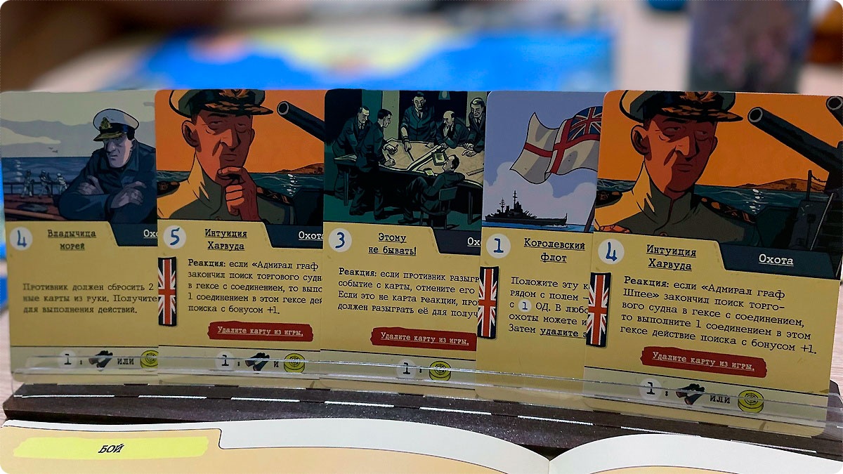 Каждый ход первым действует Германия. Она играет одну карточку, а потом добирает руку до 3, либо до 5, если рядом с «Адмиралом» есть корабль снабжения. Но это на усмотрение игрока, потому что добор до 5 – это частичная выдача информации о том, где же сейчас располагается «Адмирал». Затем в начале хода британцев автоматически плывут грузовые суда, потом одну карту разыгрывает британец, и также добирает до 5.