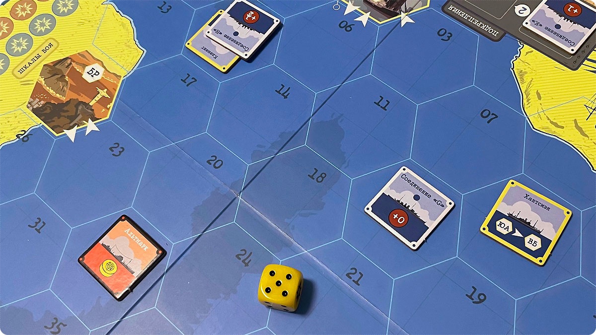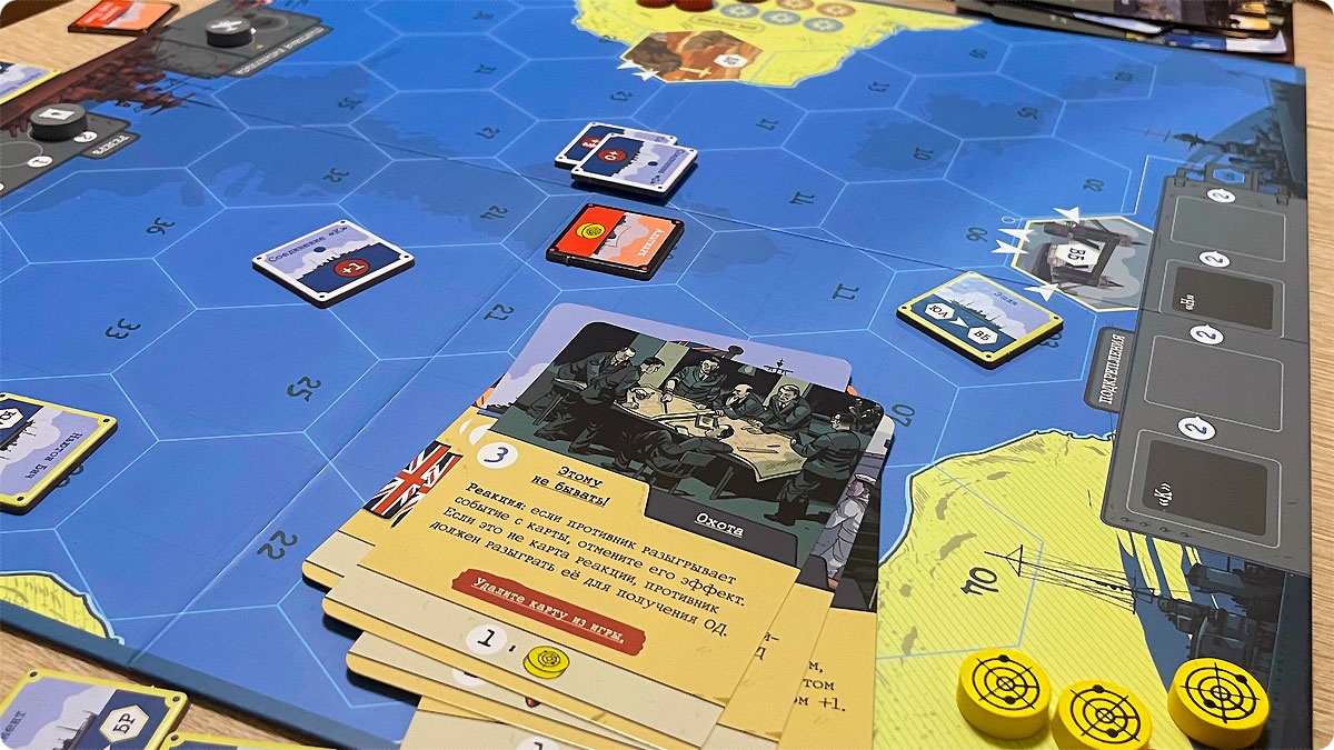 Система очков и событий на картах сама по себе неплохая, но как-то именно тут не сказать, что работает очень хорошо. Да, всё функционально. Когда-то есть хорошее событие, когда-то играешь просто очки. И ещё маленький минус – сами корабли представлены в виде квадратных жетонов. Как-то хочется, чтобы они были хотя бы картонными силуэтами, что ли… Тем более, что эти квадраты ещё и не помешаются в одном гексе, если туда вдруг заплывает несколько кораблей.