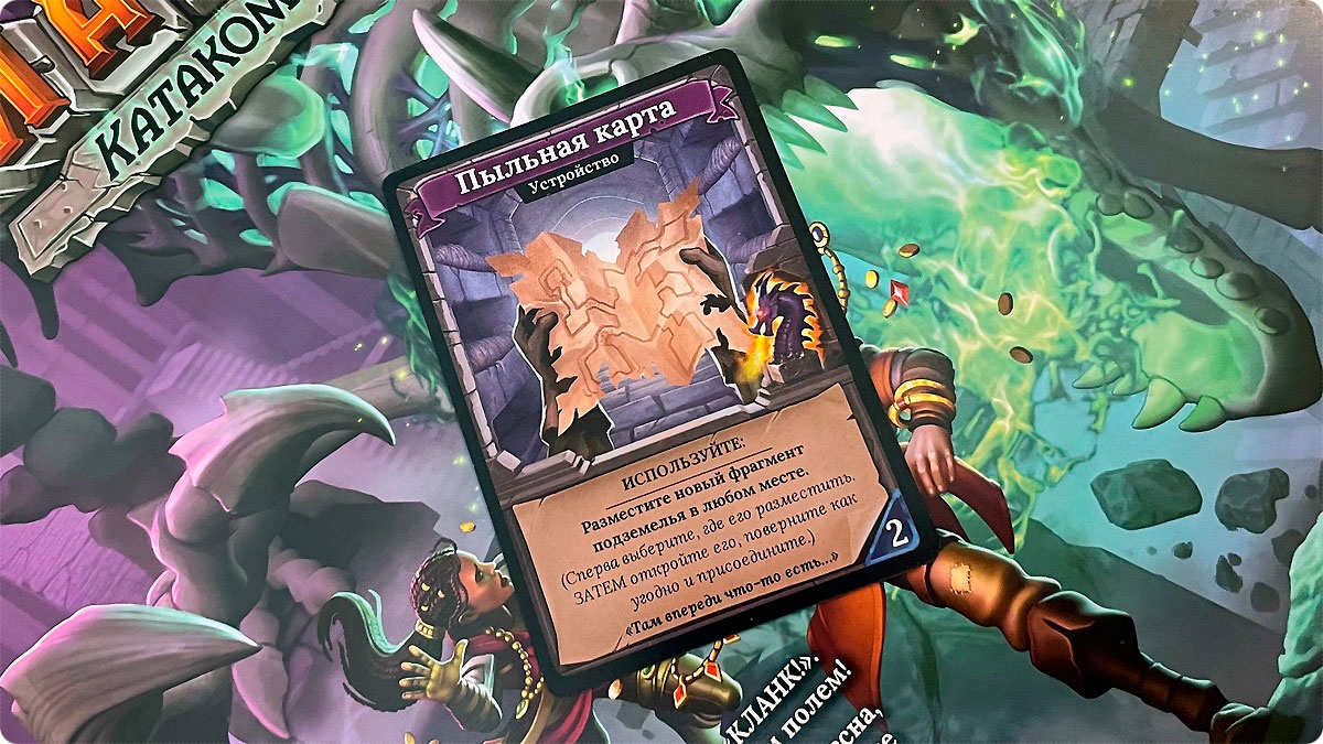 Нюанс «Катакомб» именно в том, что изначально спуск в подземелье начинается с фрагмента поля со входом, к которому впоследствии постепенно подкладываются всё новые и новые участки. Каждый раз, когда игрок делает шаг за пределы доступной территории надо взять из стопки участков подземелья новый фрагмент, посмотреть на него, и подложить удобной стороной к тому месту, куда ты идёшь. Тем самым игроки принимают самое прямое участие в формировании поля, да ещё и каждый стремится подгадать и положить новый фрагмент самым выгодным для себя образом. Скажем, если там есть какая-то вкусная находка, разумеется участок надо разместить так, чтобы твой герой сразу её и обнаружил, и ни в коем случае не прошёл мимо.