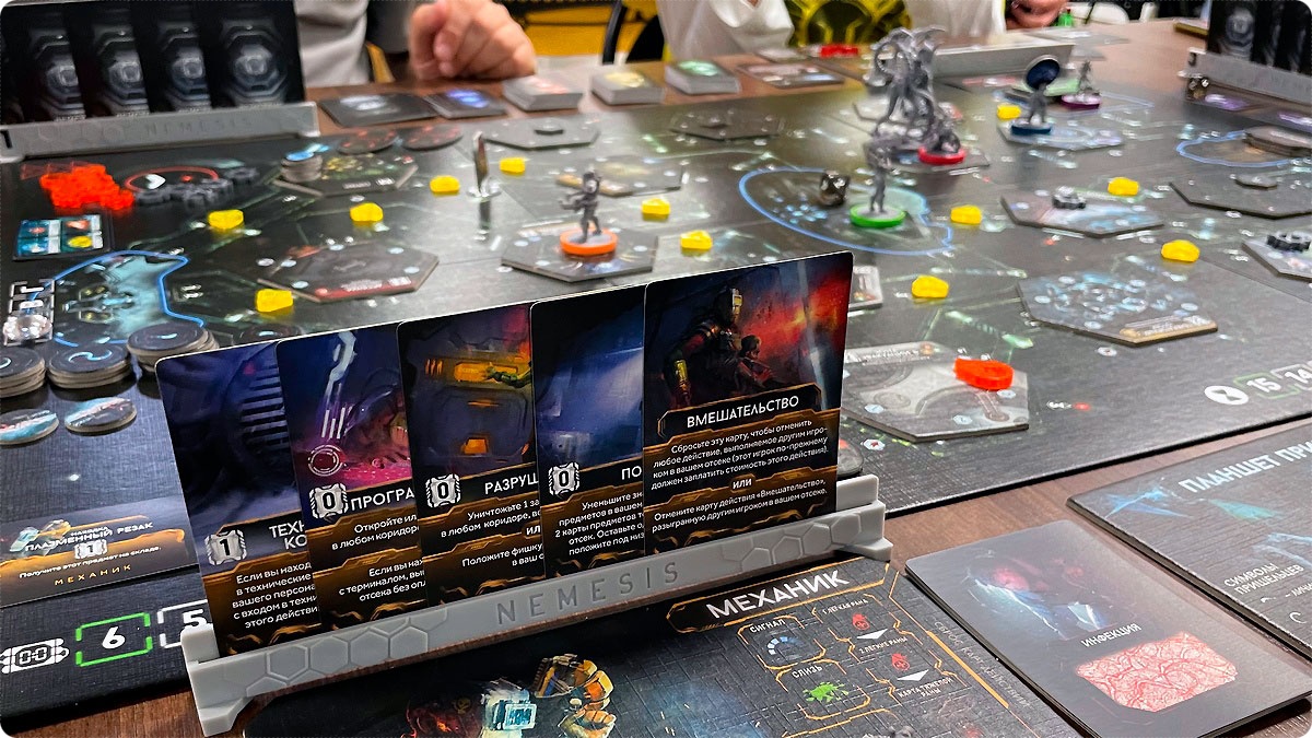 Правила, хоть и объёмные, оказались не такими сложными. Чего там, ходишь по отсекам, да кидаешь кубик на шум. Ну, разве что поначалу как-то надо было всё время лазить смотреть что можно сделать в том или ином отсеке. Ну и то, что у каждого есть какие-то свои уникальные карты действий, тоже немного путало людей, но, ничего, с этим быстро справились.
