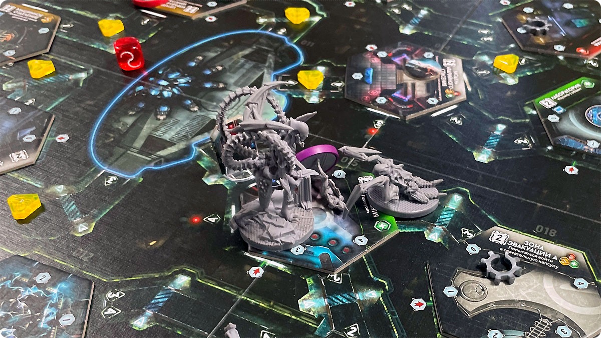 Всё было на удивление легко. Как-то бегали, весьма удачно бросали кубики, но вот оно, случилось, появляется чужой. И сразу – трутень, взрослый. На поле появилась здоровенная пугающая миниатюра, вот только на деле не так уж всё было и страшно. Схватившемуся с ним разведчику очень везло. Чужого удалось убить за несколько ходов и даже ни разу не получить рану. Монстр ни разу смог ударить персонажа, так здорово выпадали карты атаки пришельцев.