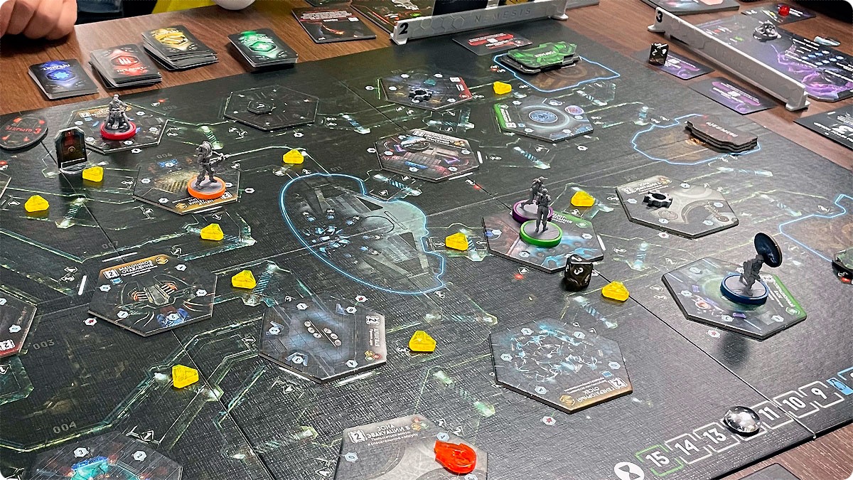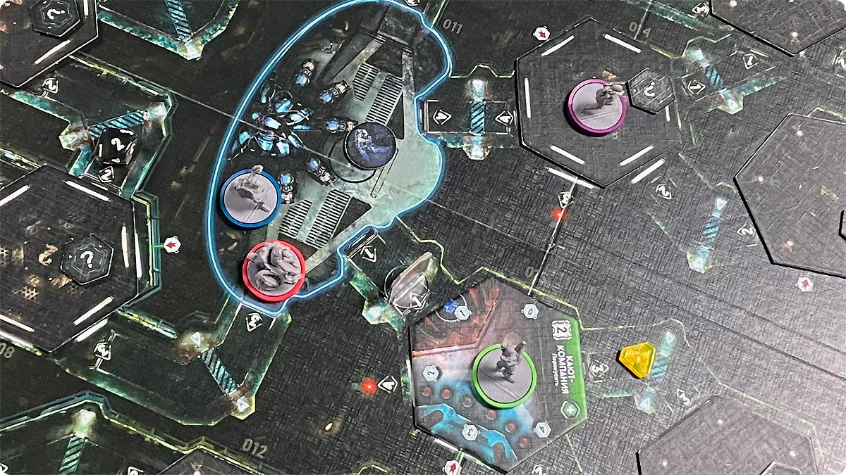 А потом – хоба – и три члена экипажа из пяти умерли за один ход. Просто выпало такое событие, что те, у кого есть личинка, мгновенно умирают. И на их месте появляются ползуны. Вот так вот разом как языком слизало трёх игроков. Умерли и всё. Нет, шанс ещё поиграть был. В полном кооперативе можно принести труп в медотсек и там его оживить. Но там же ещё чужие остались. А после удачных сражений с трутнями, которые хоть и закончились успешно, у выживших осталось не так много патронов… Так что тащить погибших в медотсек никто даже и не пытался. Оставшиеся в живых сосредоточились на выполнении оставшихся миссий. Надо было исследовать ещё пару отсеков, дойти до гнезда, уничтожить там все яйца, одно стащить и добраться до спасательных капсул.
