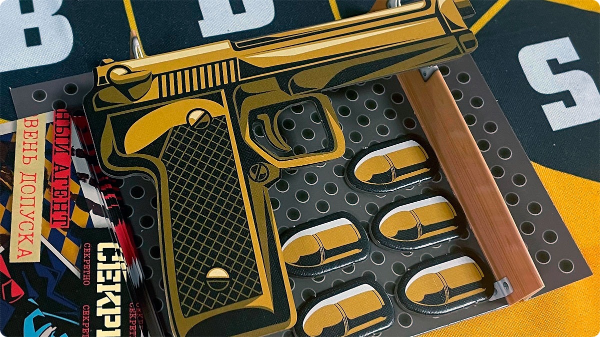 Ещё тут есть большие картонные патроны – они отображают запас попыток угадать такие карты (хотя их можно было бы заменить просто счётчиком). Наконец, у этого пистолета ещё есть целая подставка, на которой он просто лежит в центре стола. И она же служит органайзером в коробочке с игрой. Наконец, те карты, что нужно друг у друга угадывать, они могли бы просто лежать перед игроками лицом вниз, но вместо этого в коробку положили мини-подставки. На них умещается ровно одна карта, чтобы всегда держать перед глазами что там угадывают у тебя другие игроки.