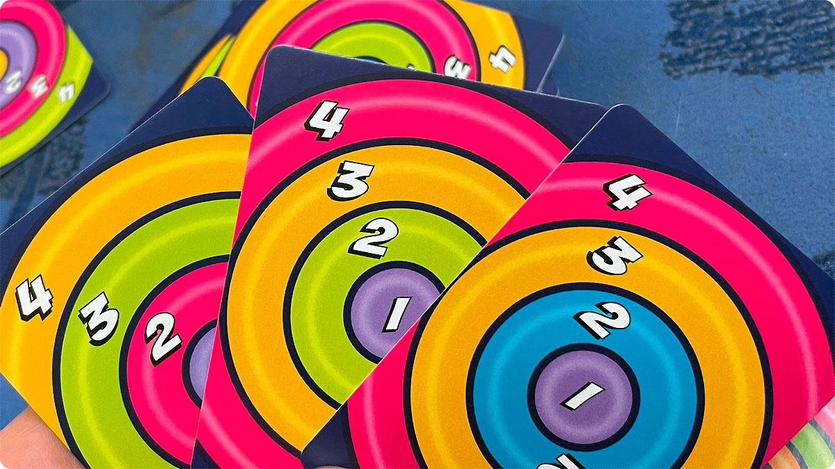 Берём карту из своей колоды, смотрим, если на ней есть круг, совпадающий по цвету и номеру с кругом в центре стола, кладём её туда. Скажем, в центре второй круг розовый, и у вас на карте второй круг розовый, всё, можно её играть. Если совпадения нет, открываем следующую карту, и так, пока не найдётся подходящая. Тем же самым занимаются в это же время другие игроки, так что получается такой весёлый хаос с элементом «кто первый кинул карту».