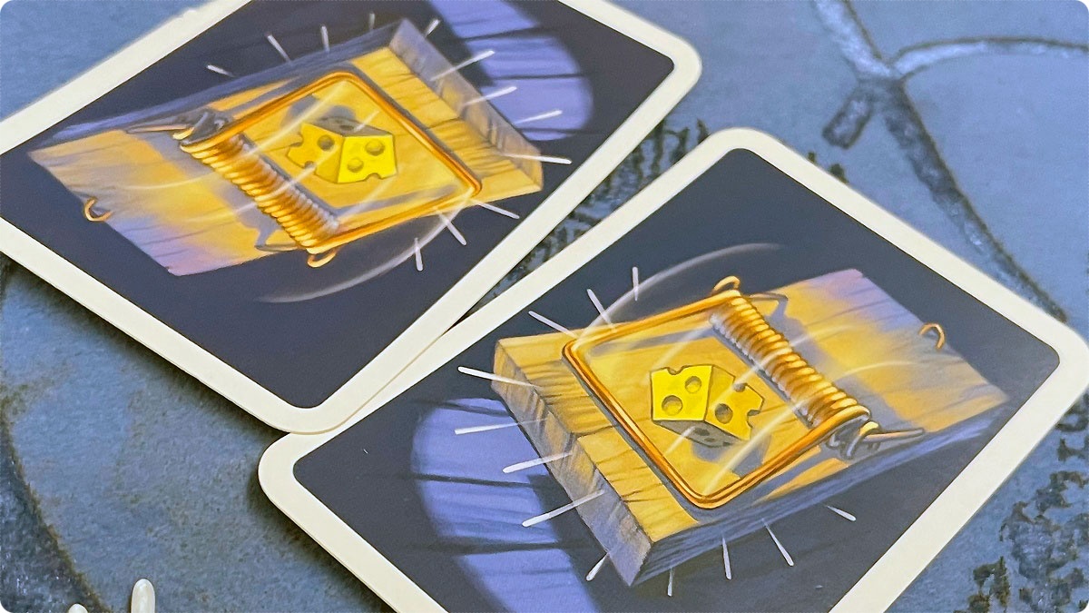 Фишка в том, что когда ты берёшь карту, нужно её перевернуть и посмотреть, что там на обороте. Там может быть настоящий сыр, и тогда всё хорошо, либо мышеловка. Мышеловка – это не очень хорошо. Если набрать их три, ты вылетаешь из игры, и партия на этом заканчивается.