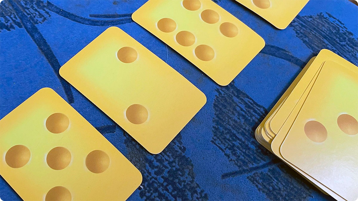 Из компонентов тут по сути только карты. На них нарисованы точки, от 1 до 6. Выглядят они как на кубике, но по сюжету это как бы дырки в сыре. В начале партии 6 карт раскладывается на столе, рядом кладётся колода. Затем первый игрок делает ход – бросает кубик, смотрит, что выпало, а затем можно забрать со стола карточку с таким значением.