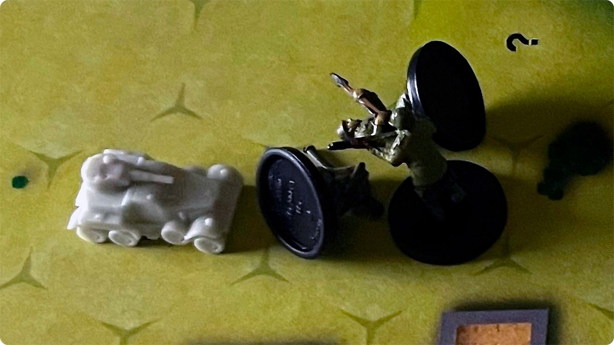 Далее ход или два просто перебрасываемся кубами. Раненые восстанавливаются. Противник не может их убить, но и его выбить не получается. Наконец, удаётся расстрелять одного из пулемётчиков. Можно выдвигаться дальше, прямо к церкви. Увы, оттуда начинает бить тяжёлый пулемёт. Опять несём потери, огрызаемся огнём в ответ, но пули уходят в молоко. Да и если бы и попали, на счётчике последний ход, так что даже если бы пулемётчик противника пал, хода на то, чтобы зайти в церковь всё равно не хватает. Надо переигрывать!