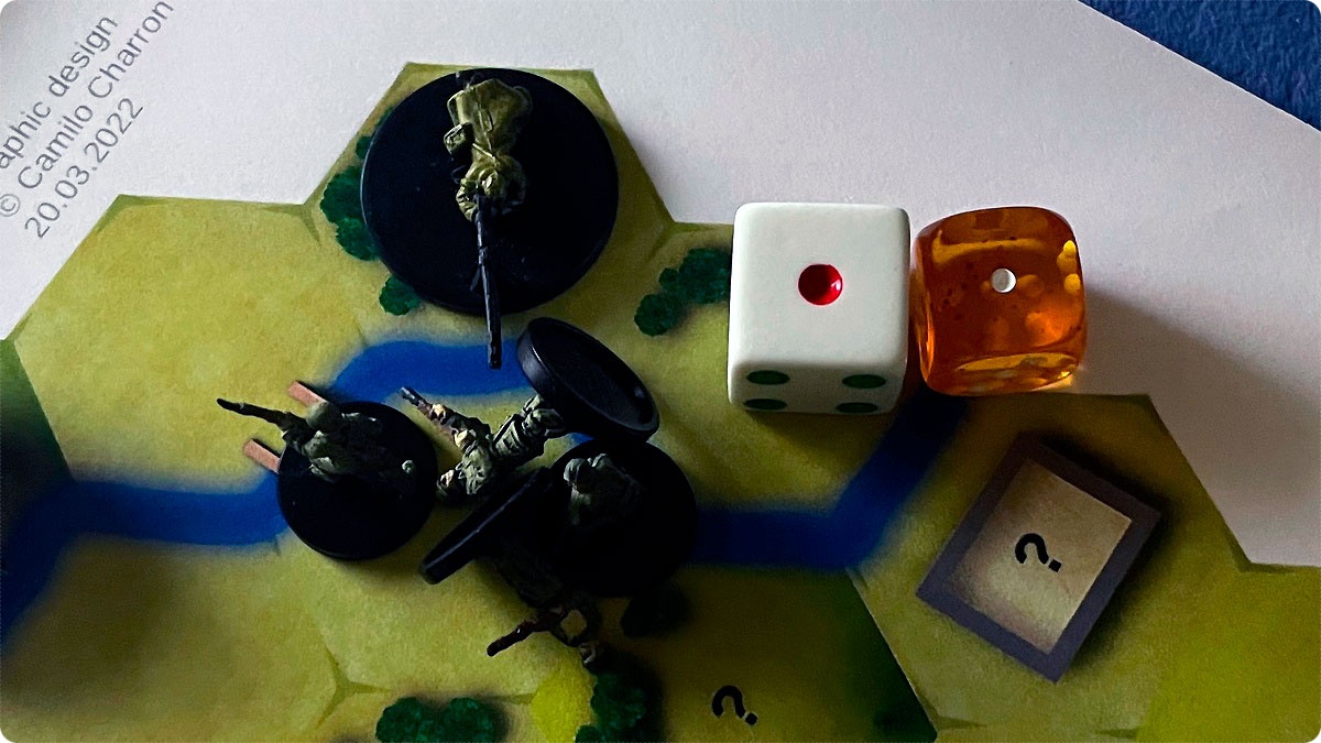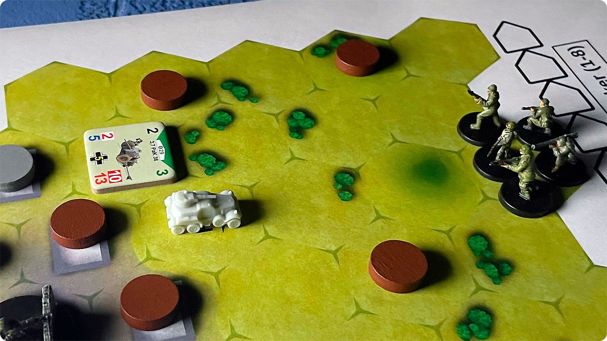 Ещё один подход к «Полям Нормандии». Предыдущий сценарий всё-таки переигрываем. На этот раз идея такая: вот солдат пускаем в атаку прямо по открытой местности. Пусть бегут, выбивают артиллерию и противников рядом с ней. Вроде бы расчёт оправдывается. Кубики ложатся довольно удачно, старт сценария получился хорошим.