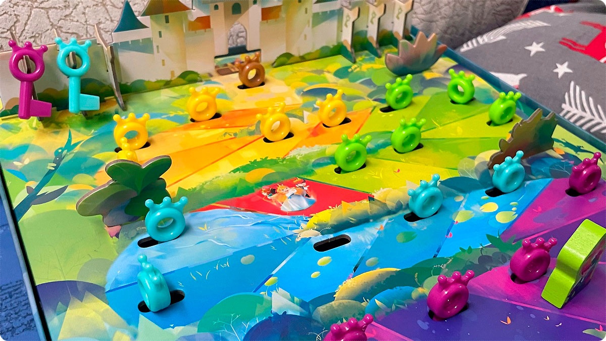 Ещё одна партия в «Волшебные ключи». Хочется верить, что теперь-то, уж, сыграли без отступлений от правил. А то как-то не сразу дошло, что если на всех кубиках выпали месяцы, то фишка не возвращается на стартовую позицию, и следующий игрок продолжает с того места, где ты остановился (как бы это ни было несправедливо, мало того, что тебе не повезло с кубиками и никуда дойти не удалось, так ещё и соперник получает преимущество). Ну и ещё заодно оказывается, что если первым броском выпали исключительно месяцы, то и в этом случае телепортируешься в центр поля (на красную клетку).