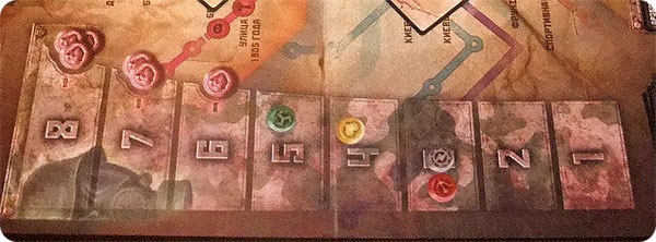 Также в игре имеются несколько видов жетонов. Есть три вида ресурсов: патроны, свиньи, грибы – они находятся в игровом банке и выдаются игрокам по мере производства. Кроме того, у каждого игрока есть набор жетонов своего цвета, которыми помечаются захваченные станции. В самом начале партии на поле выкладываются по три таких жетона (в начале игры у каждого игрока уже есть по 3 станции), а затем по мере захвата новых игроки также будут помечать их этими жетонами. На таких жетонах изображены всё те же ресурсы: патроны, свиньи, грибы – при захвате станции на неё выкладывается соответствующий жетон (например, если вы захватили станцию, которая производит патроны, вы выкладываете на неё жетон своего цвета с изображением патрона).