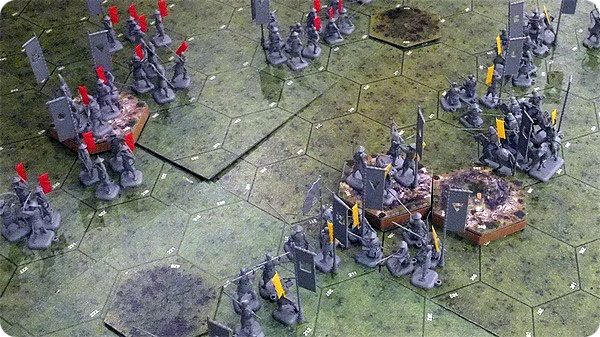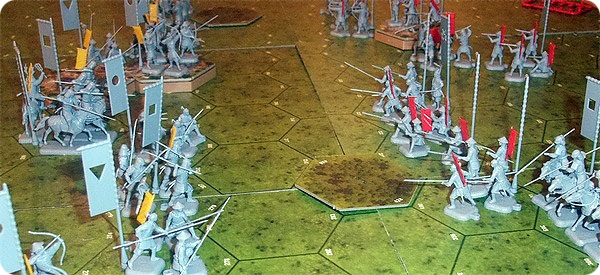 Вот, кажется, и все нюансы. В остальном же перед нами всё та же система Commands & Colors с учётом реалий средневековых войск. Карты приказов бывают секционными и тактическими, последние акцентируют внимание на маневрах строем, как и в Ancients и Battlelore. Войска всегда дают сдачи, два соседних отряда (равно как и командир) позволяют игнорировать один флаг. Местность на полях сражений достаточно бедновата (тогда предпочитали сражаться на равнинах).