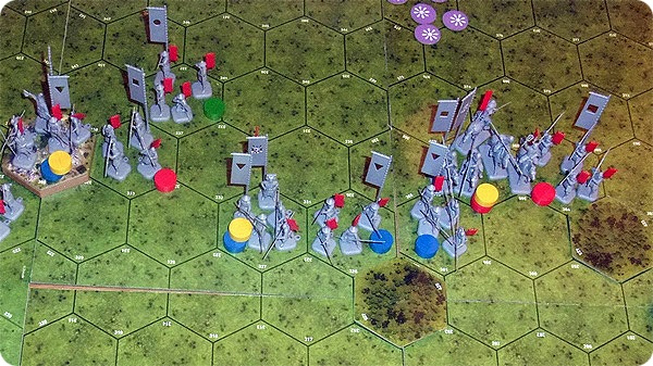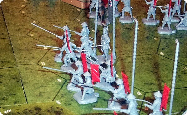 В этот момент родилась крамольная мысль – так-то можно вообще фигурки убрать и полностью заменить их дисками. Смех-смехом, а рациональное зерно тут имеется. Многим, например, гораздо удобнее играть в C&C блоками, как в Ancients и Наполеонике. Их и двигать проще, и отличаются они лучше. А в Битвах самураев, тем более, как я уже сказал, многие миниатюры негабаритные, из них что-то куда-то торчит, двигать их сложновато. Те же кони, например, с лидером, вообще еле-еле в гекс умещаются (тут конный отряд состоит из 4-х фигурок, а с командиром их становится 5).