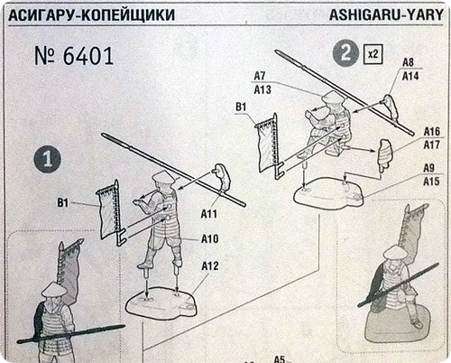 Чтобы узнать это пришлось взять схему, по которой я собирал миниатюры. Там напротив каждого типа солдат указаны их названия. И что вы думаете? Просмотрел я эту схему, и никаких «асигару с яри» не нашёл. На всякий случай просмотрел ещё раз. Потом – ещё. Нет, и всё тут. К счастью, я догадался прочитать ещё и англоязычные обозначения. И сразу нашёл ответ – «Asigary-yaree» . Тут же указано и русское название этого типа войск – асигару-копейщики.