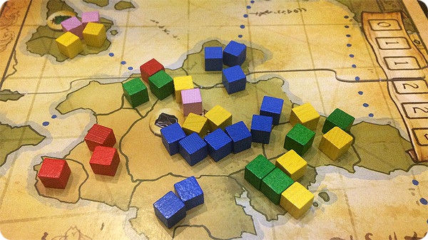 Во второй партии впечатления от игры были не такими радужными, как в первой. Исчез эффект новизны, не надо было так подробно разбираться в правилах (хотя в начале мы немного освежили в памяти фазы хода, как-никак месяц с предыдущей игры прошёл), по крайней мере мне стало заметно, что боёвка, из которой, вообще-то, и состоит весь Риск, очень-очень незамысловатая. Ладно, хоть, у нас на кубиках интересные цифры выпадали. То защита устоит с результатами броска 1:1, то какая-нибудь эпическая победа случится. Этого, конечно, у Риска не отнять. Случайность хоть и есть, но она воспринимается позитивно (по крайней мере потому что у меня откровенно плохих бросков в отличие от других игроков не было).