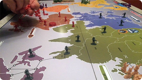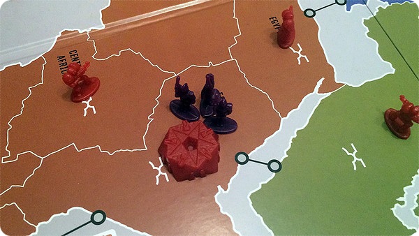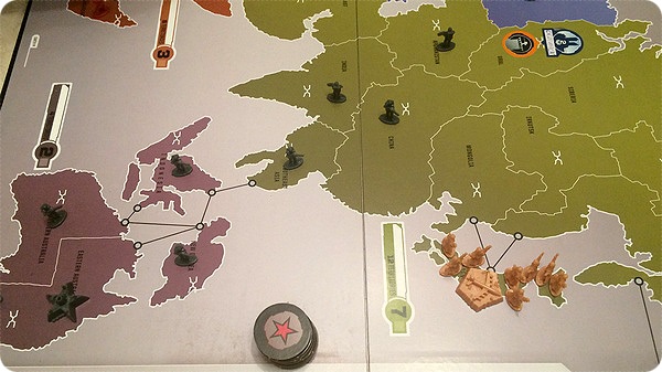 Так, одна из фракций уже в первом ходу перебросила войска из Южной Америки в Африку и захватила там чужой штаб. Учитывая, что 2 звезды у игроков были уже изначально, третья звезда на первом ходу – это очень круто. Для победы, напомню, их надо набрать всего 4. У меня, кстати, шансы на выигрыш были минимальны, потому как я выиграл первую партию и из-за этого вместо дополнительного очка на старте получил одну ядерную ракету. Не бог весть какой бонус, это, ведь, всего лишь раз в бою можно превратить любой результат броска в шестёрку. Один раз в бою за всю игру.