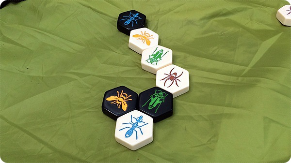 Обе партии играли с новичком, поэтому изначально я отказался от одного муравья и одного паука. Но даже такой гандикап не позволил не победить. В партии я продемонстрировал две с половиной основные тактики — блокирование муравьями фишек противника, атака матки рогатым жуком по головам врага и увод своей королевы из окружения. Дополнительные фишки (москит, божья коровка) по традиции остались лежать в чехле. Мы и с опытными игроками их не используем, а новичков, вообще, смущать лишними насекомыми незачем.