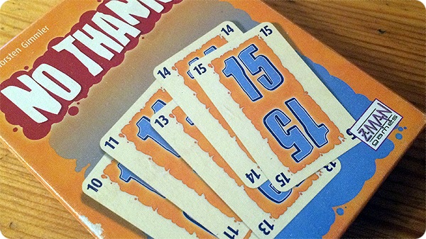 Сам я когда побеждаю в No Thanks!, обычно это одна и та же ситуация, берёшь в начале партии что-нибудь в районе двадцаточки, потом собираешь кобинацию в обе стороны и заканчиваешь с 3-4 картами подряд и небольшим количеством шекелей жетонов в кулаке. Значительно реже победа достаётся если у тебя большой разброс, какая-нибудь десятка и что-то ближе к 30. Но на то она и игра, с азартом и риском.