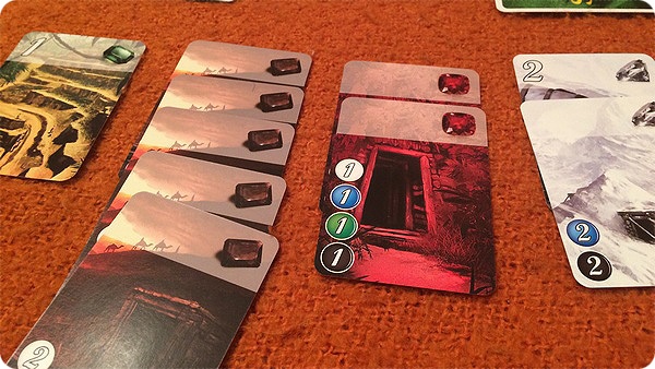 В Splendor играли в три захода. Сначала была серия из пяти дуэльных партий, сыгранных одна за другой в режиме нон-стоп. Остановились только потому, что был вечер, поздно, а завтра на работу. Вдвоём игра получается стремительной, жёсткой и очень конкурентной. Очень важны задания, приходится внимательно следить за соперником и при каждом удобном случае воровать нужные ему карты со стола.