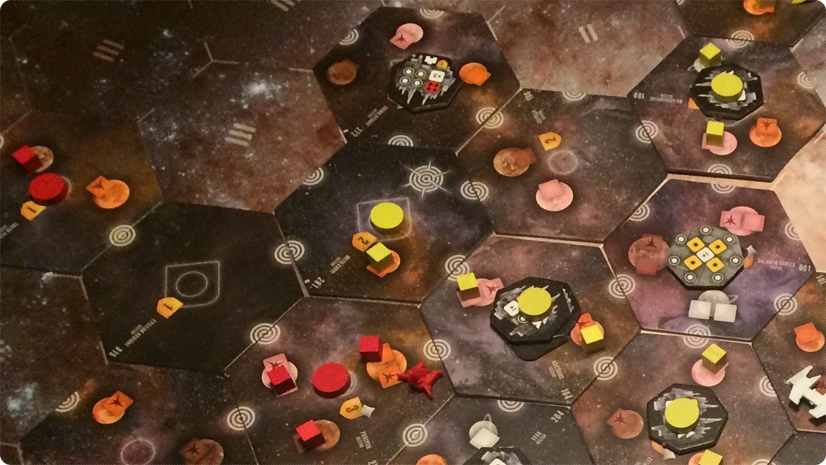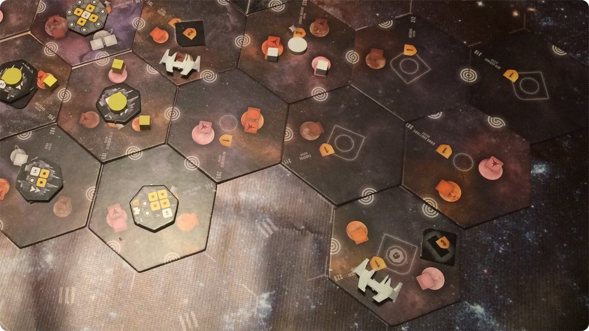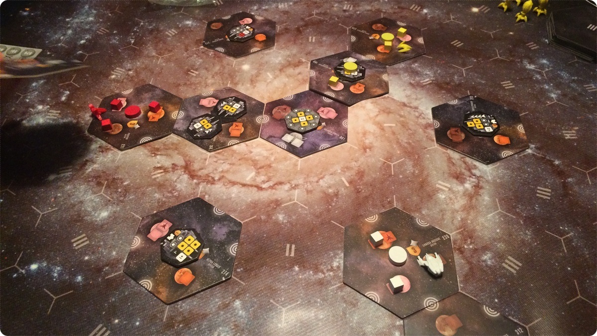 Прикидываю примерный расклад. Жёлтые будут по-максимуму стремиться захватить гексы центрального круга. Помешать им, особненно на начальном этапе, будет тяжело. Поэтому придётся податься куда-нибудь ещё. А именно — в глубокий космос. В партии на троих используется всего лишь 10 секторов III круга, и мне стоит забрать максимально возможное число. И, желательно, получить как можно больше находок.