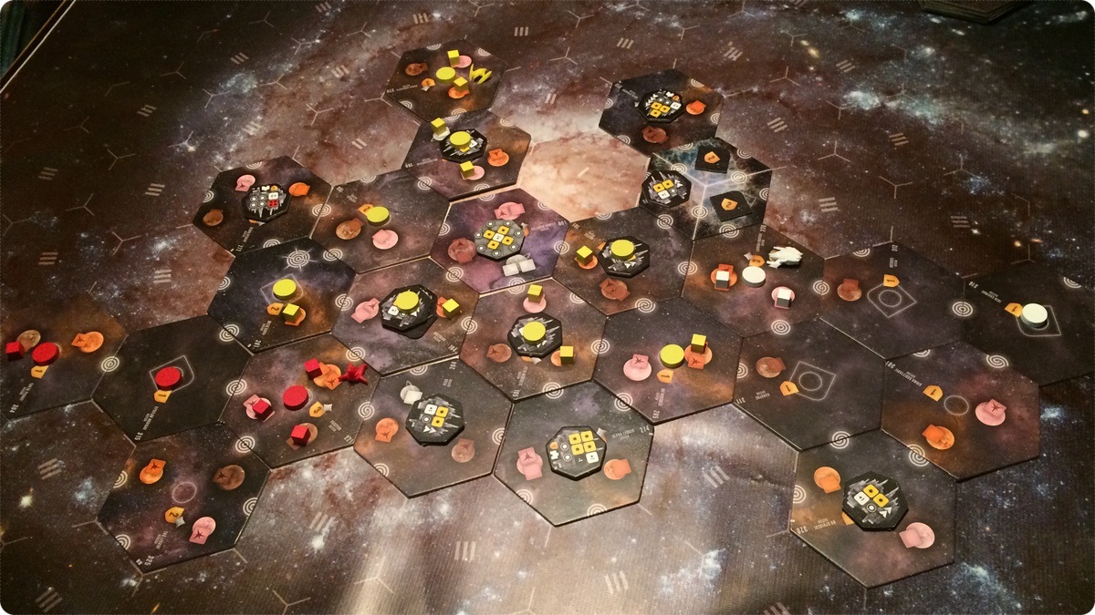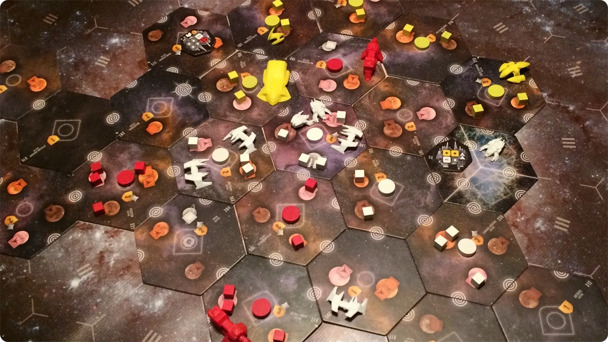 Ситуация: я прорвался в центр, красные вышли на тропу войны, а пострадал от этого исключительно жёлтый игрок. В общем-то, ситуация типичная. В наших партиях это не первый раз, когда Драко распыляются в начале по множеству систем, после чего заслуженно получают по шее, когда остальные игроки глядя на сложившуюся ситуацию коллективно решают восстановить справедливость.