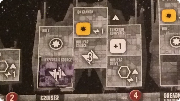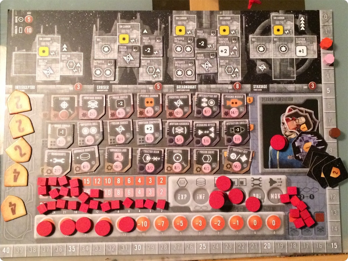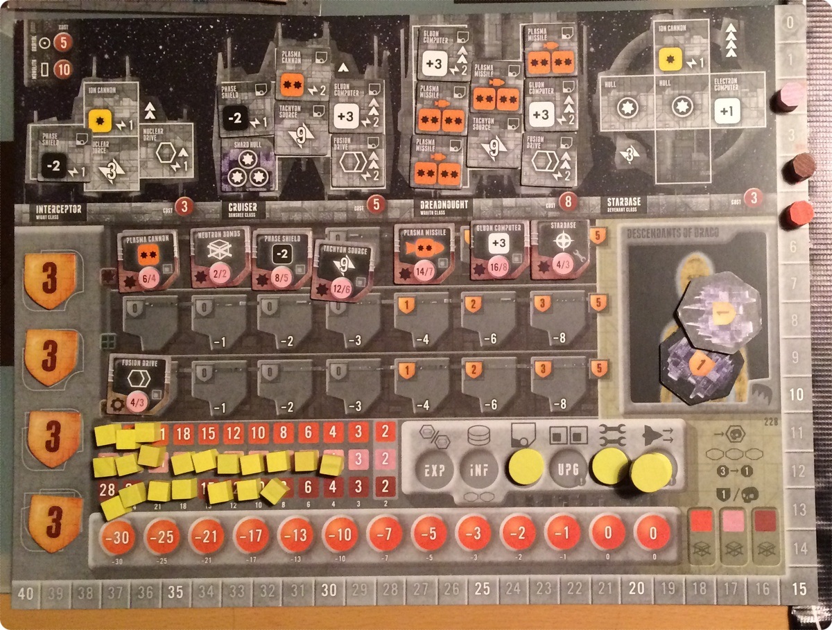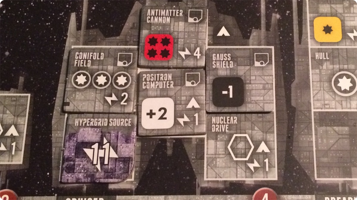 Определив для себя вводную, я начинаю исследовать гексы дальнего космоса. И удачно, первые два гекса попадаются пустые, без планет и с находками, приносящими +5 науки и +6 материалов. Отказываюсь от очков и беру ресурсы. Пригодятся. Вскрывается ещё один гекс с инопланетянином, один без находок с денежной планетой (не занимаю) и ещё один пустой, с находкой — самая дешёвая технология. Беру гаусовый щит (-1 к кубику противника). В начале партии это не только экономия в 2 науки, это ещё и лишнее действие. Ну и скидка на будущее, хотя бы и самая мелкая, совсем не помешает.