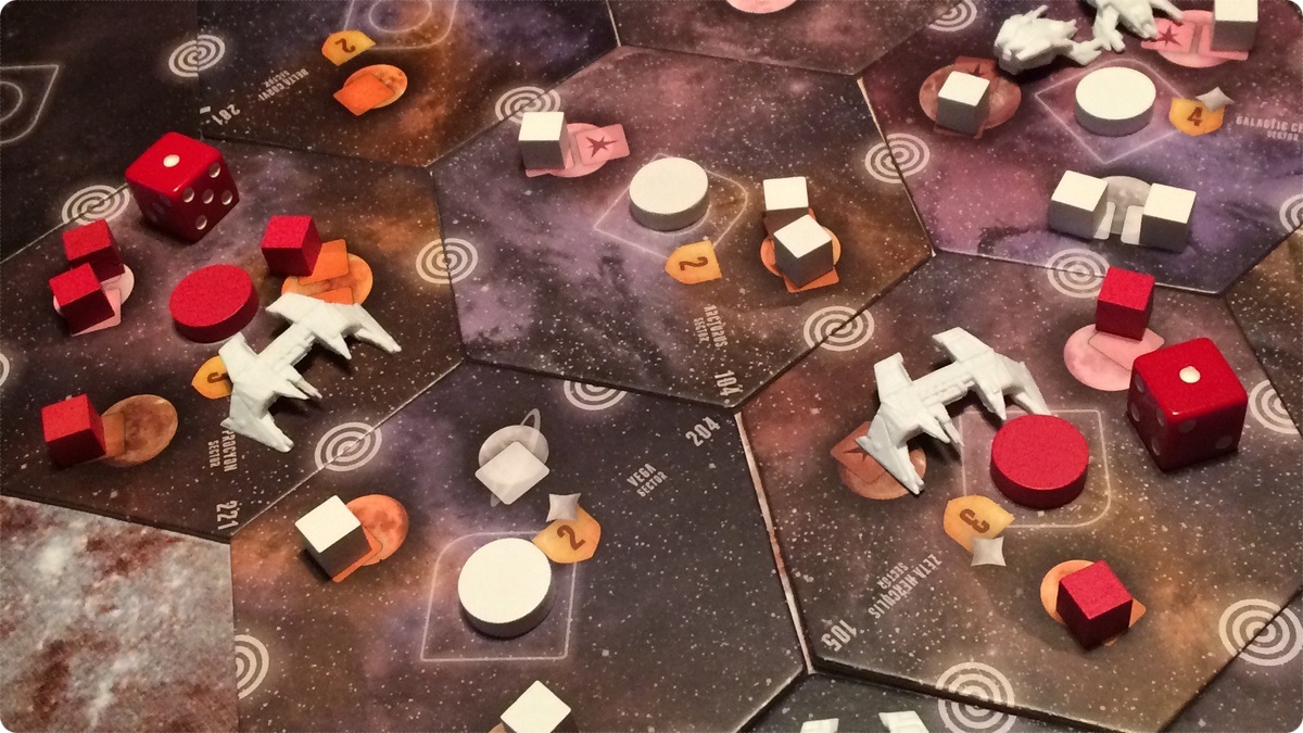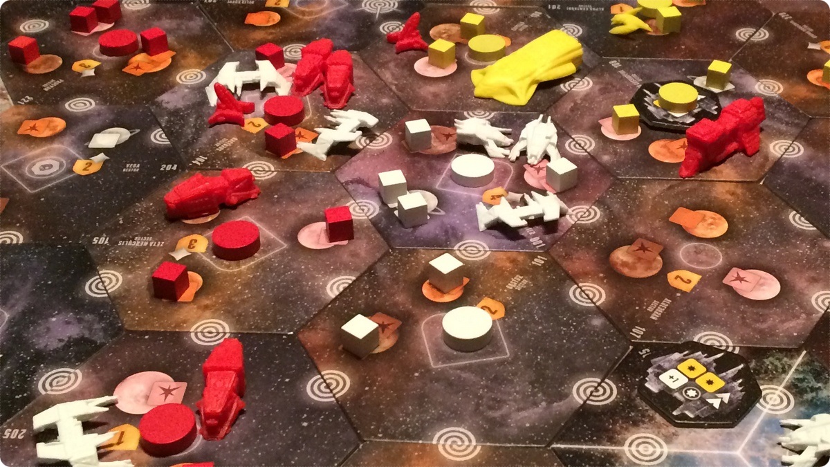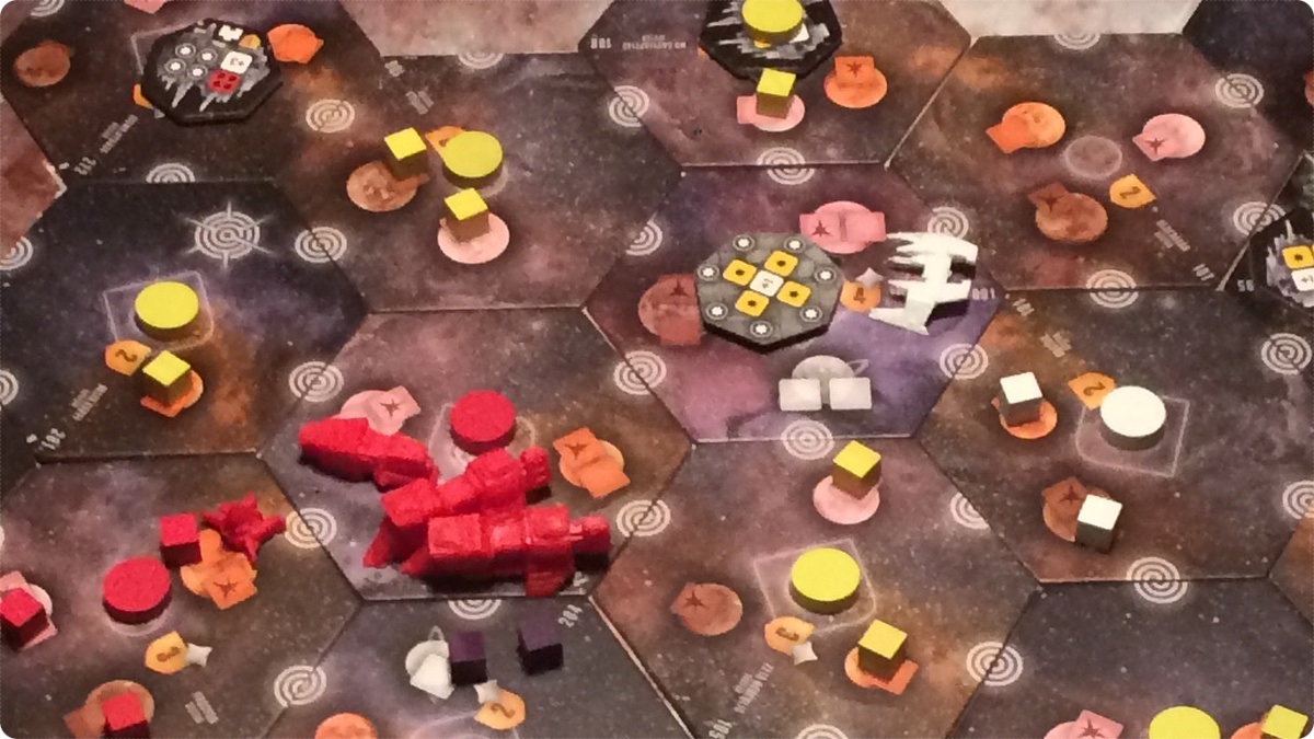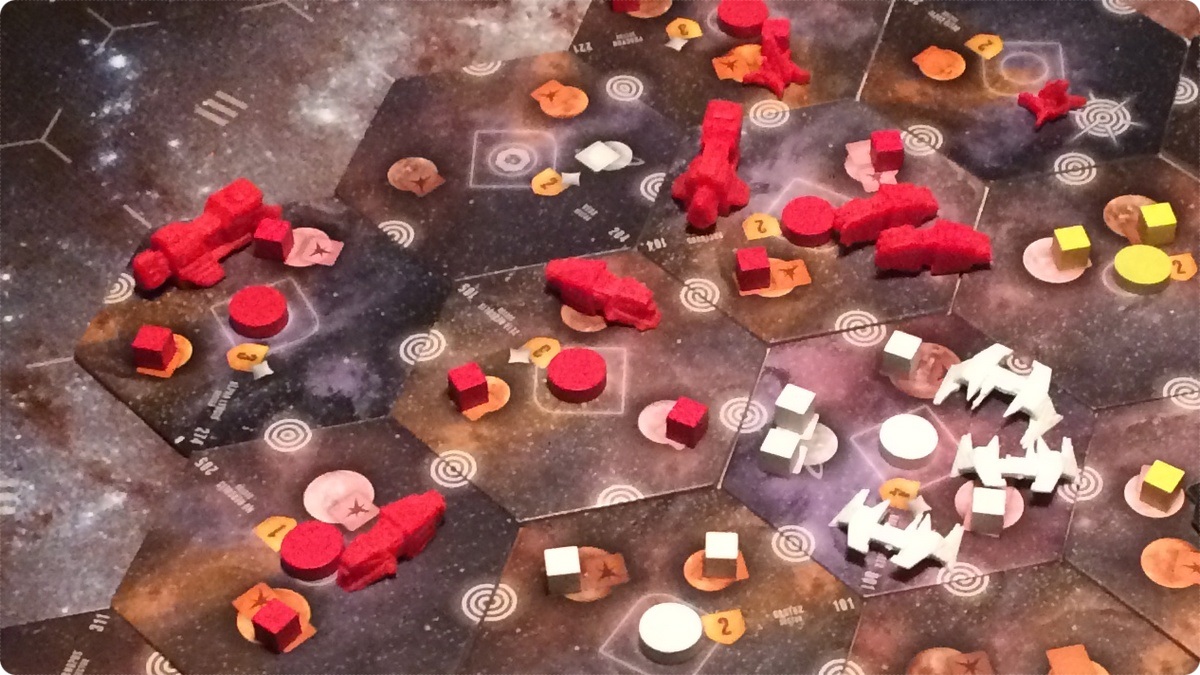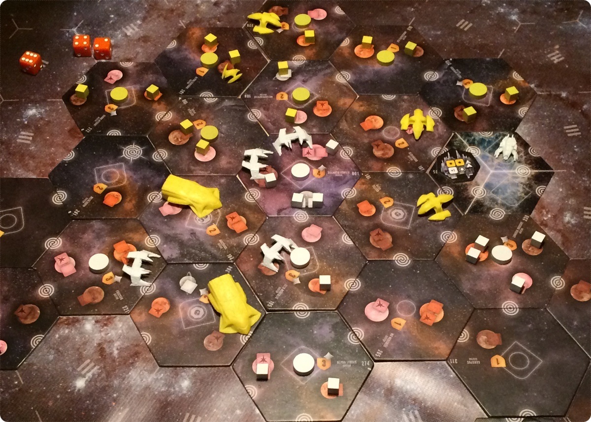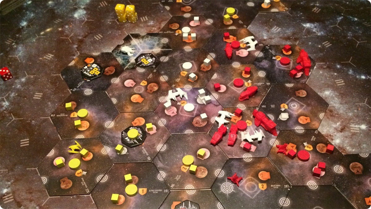 В следующем ходу начинают работать верфи у красных. На поле появляются два дредноута и крейсер, которые отправляются в родной мир древних, где успешно выигрывают бой, будучи дополнительно обвешанными только двойной бронёй, без каких-либо других улучшений. Жёлтый отводит крейсер в центр, где в результате упорных боёв всё решает кубик: при равных шансах на победу крейсер погибает, чуть-чуть не успев добить оборонительную систему галактики. Жёлтый игрок (Гриша) уже не в первой партии вот так вот разбивается, частично уповая на удачу.