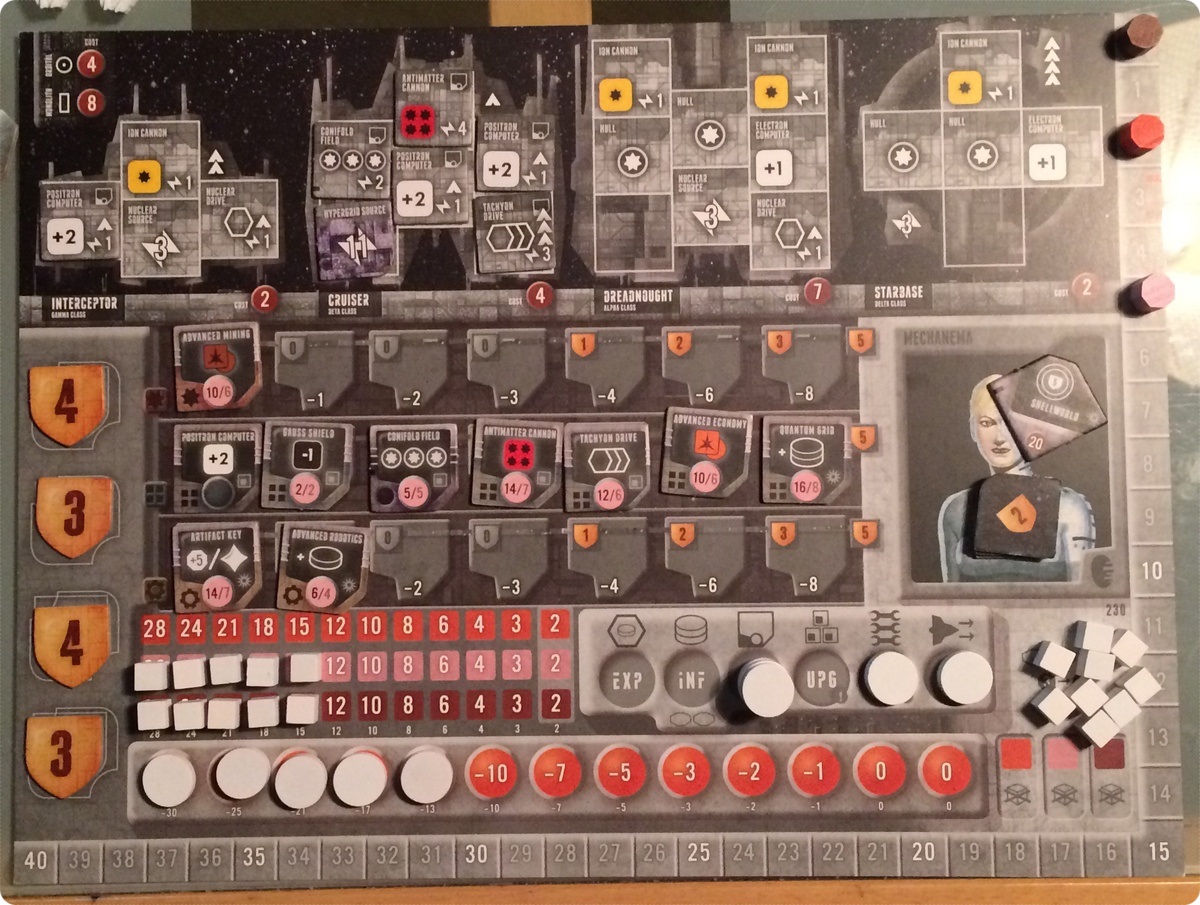 Играть за Механему здорово. Покупать корабли со скидкой — это ощутимый бонус, да и стартовый компьютер +2 тоже, знаете ли, хорошый плюс. При этом никаких минусов у белых инопланетян. Считаю, это сильная раса. И даже пара ошибок не помешала ими выиграть. Я, например, в середине игры "зевнул" один неплохой сектор, уведя оттуда свой корабль в центр, после чего жёлтый моментально воткнул туда свой диск с помощью Influence. При том, что мне самому ничего не мешало сначала сделать influence, а потом убрать из того сектора корабль.