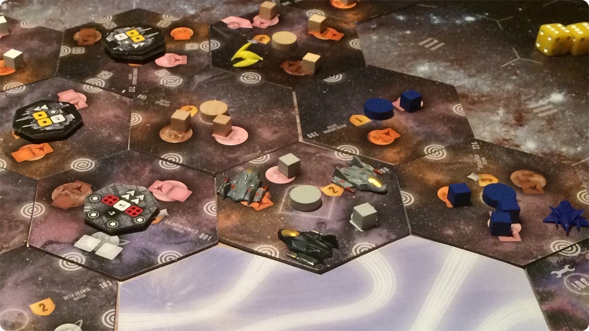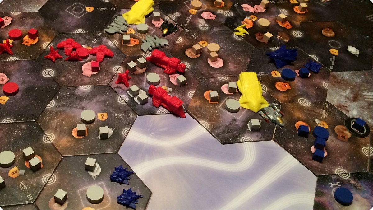 Очень много крутых моментов — и напряженные 30 кубиковы дуэли на ракетах в стиле Хонор Харрингтон и эпическая «холодныя война» двух флотов, которые стояли на соседних гексах всю игру и копили силы ради одного удары.