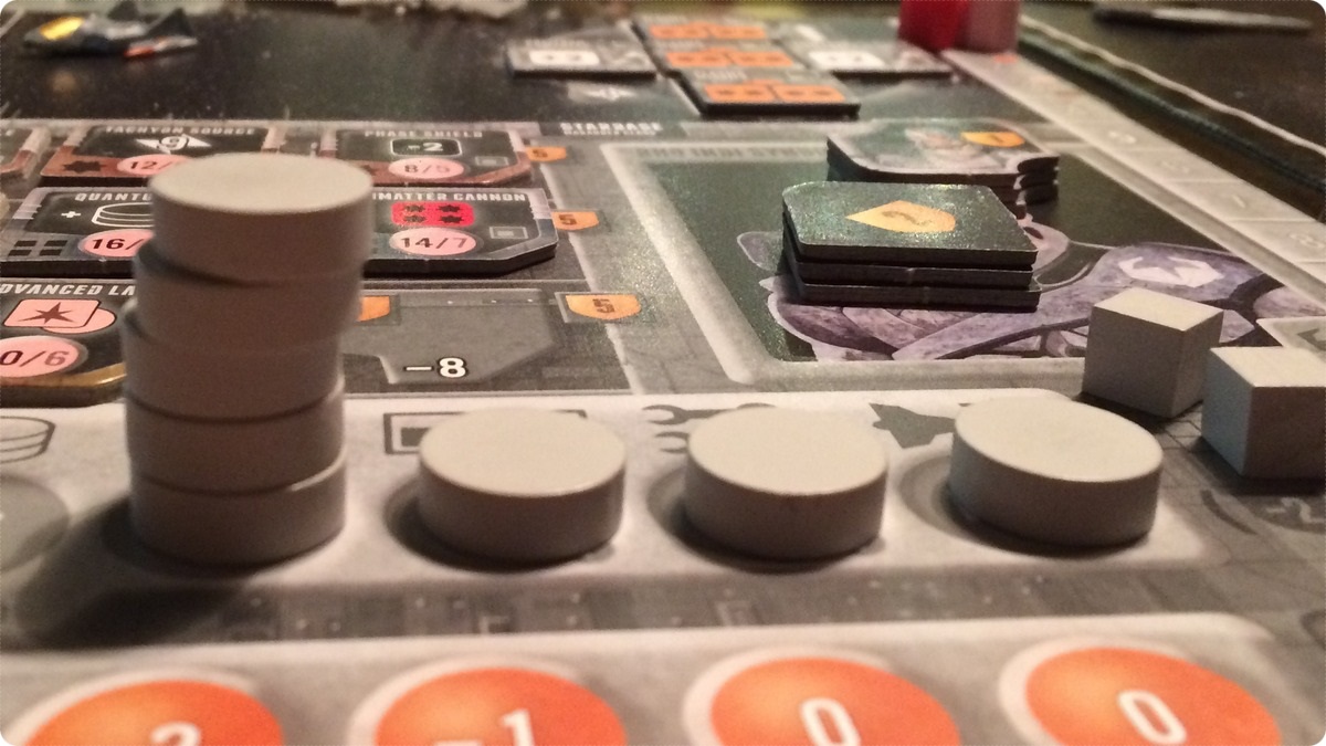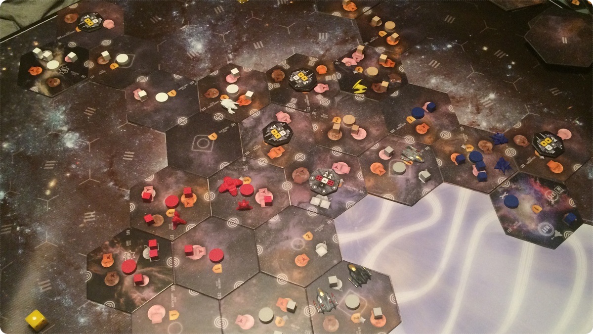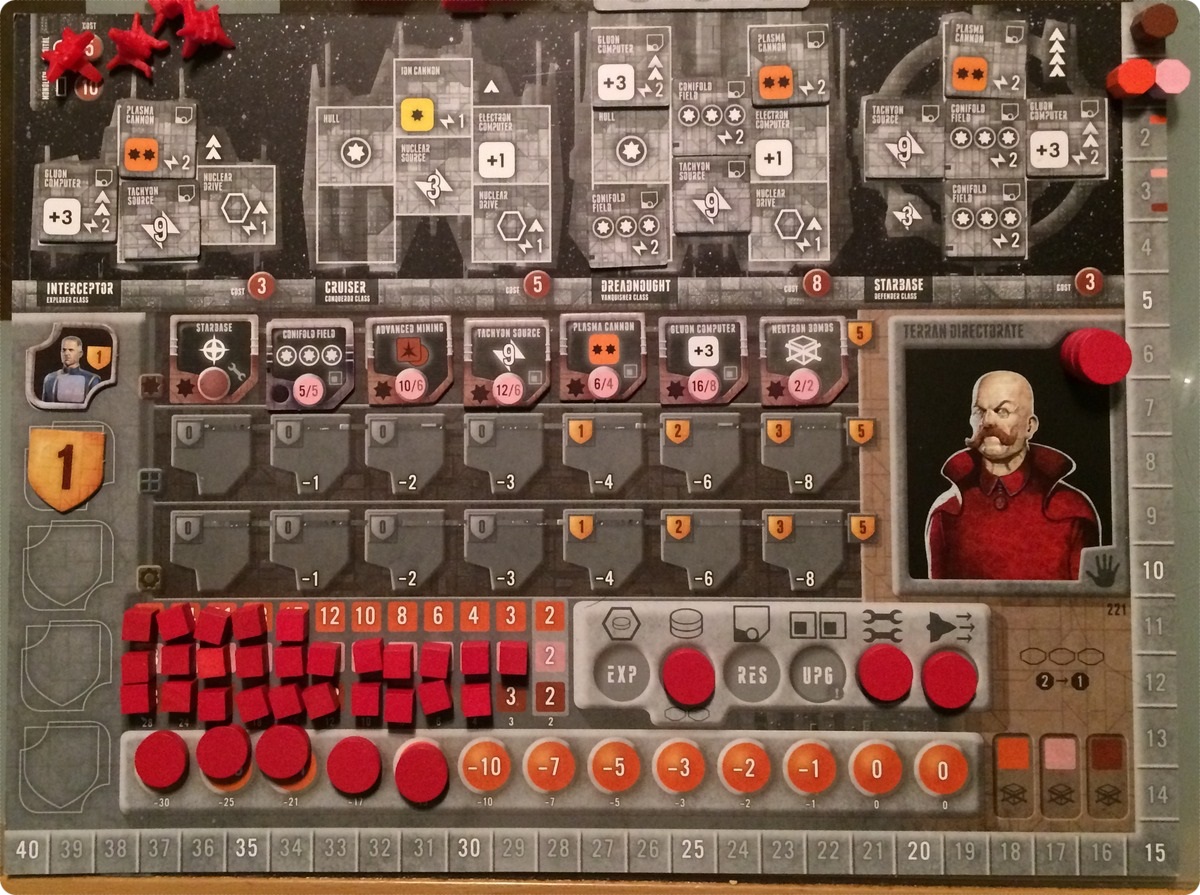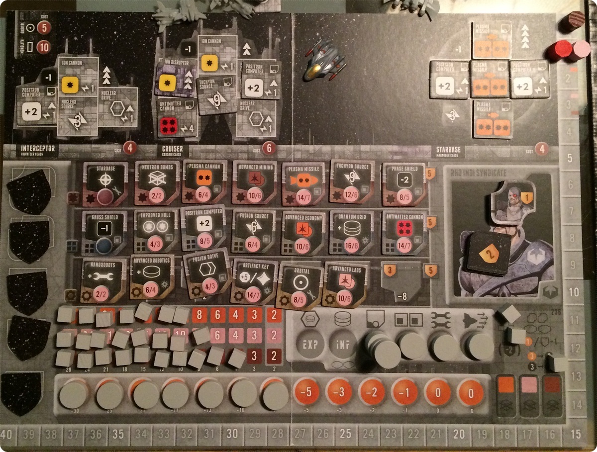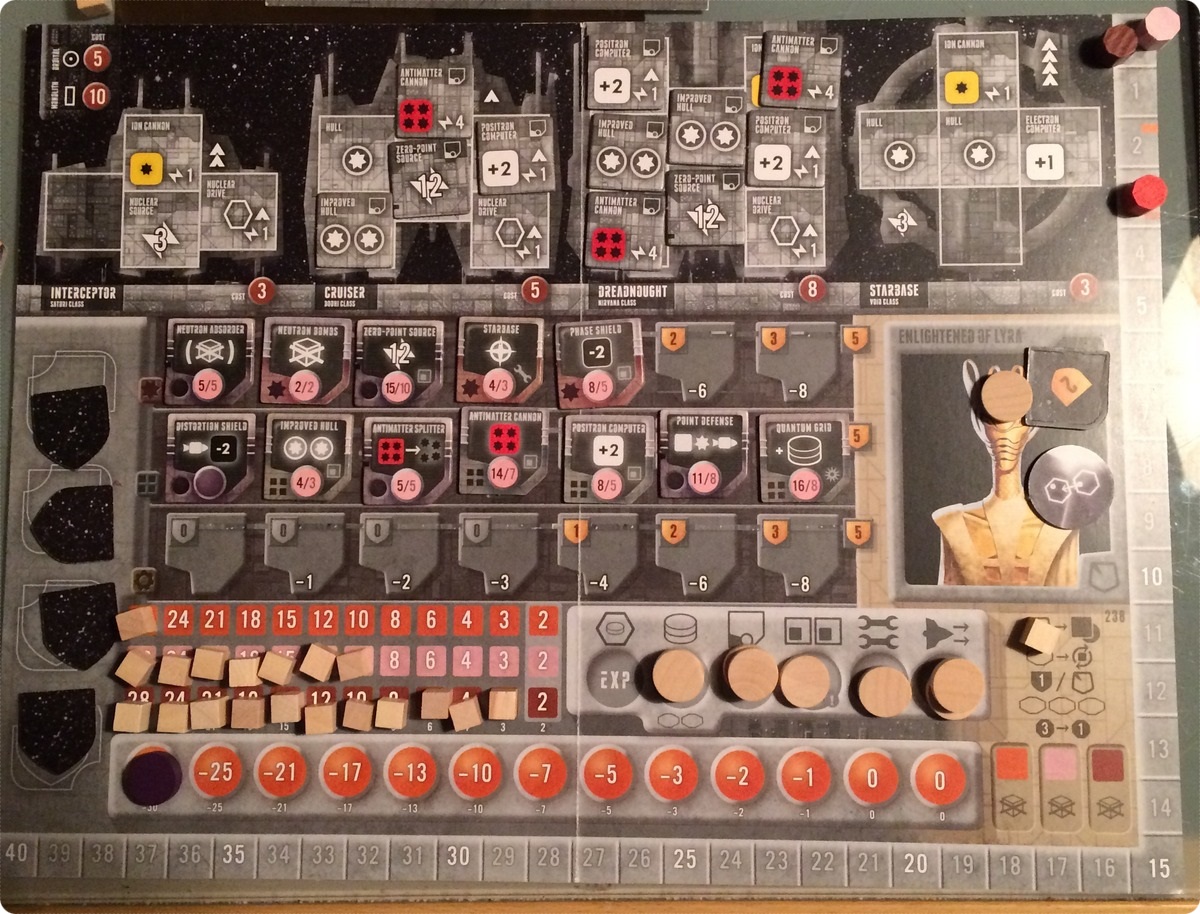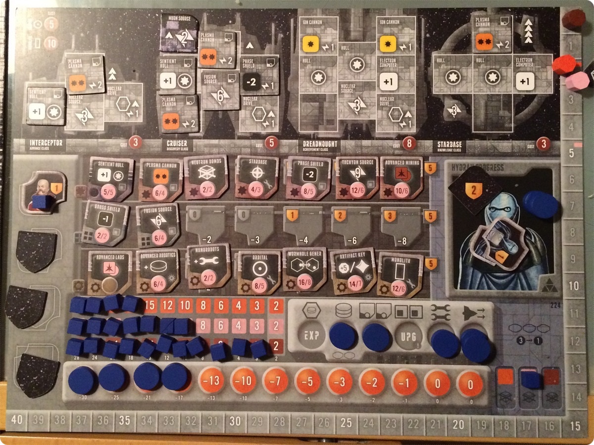 Несмотря на то, что в этой партии не было каких-то глобальный войн, мне всё понравилось. Я сражался с самого первого хода, буквально выгрызая победу из каждого доступного действия. Смог накопить достаточно науки, чтобы выкупить технологию, позволяющую занимать коричневые планеты со звёздочкой, чтобы иметь достаточный запас материалов. Умудрился приобрести все три дополнительных диска. Ну а под конец мне не хватило всего чуть-чуть, чтобы полностью заполнить все три линейки технологий.