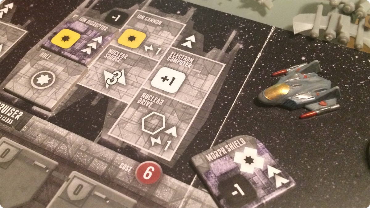 В первом же ходу я напал двумя истребителями на инопланетянина и успешно его уничтожил. В качестве находки мне выпал крейсер, который я, конечно же, взял не очками, а в натуральной форме. Впоследствие крейсером и ещё одним истребителем я выбил ещё одного инопланетянина, из которого вывалилась интересная деталь: не требующая энергии ионная пушка, дающая бонус +3 к инициативе корабля. Поразмыслив, я нацепил её на свой крейсер, прикинув, что пусть он у меня всегда первым стреляет. Буду стараться воевать так, чтобы у врага не было возможности сделать ответный залп.