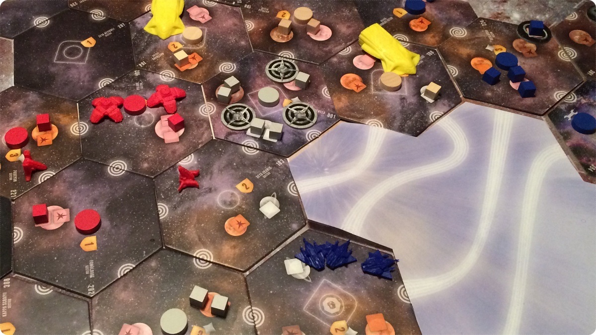 Эта партия научила нас важности гексов I круга. Позволь противнику вскрыть твой участок – и ты будешь отрезан от остального мира, как это произошло с синим игроком. Такая ситуация сложилась у нас впервые, но я считаю, это весьма важный момент и даже хорошо, что мы получили столь наглядный урок. Так что в другой раз ещё нужно будет как следует подумать, что ценнее: возможность выкупить уникальную технологию, или самостоятельно вскрыть свою "единичку".