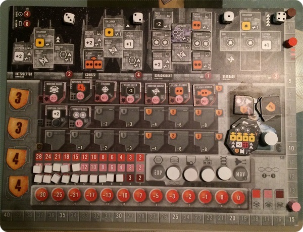 Партия для меня складывалась ровно, никаких неожиданных поражений и неудач. На начальном этапе вокруг вскрылись сплошь куцые сектора, так что пару ходов я существовал в стартовом гексе. Потом начал строиться и бить инопланетян, в том числе боссов. В одной из схваток потерял линкор, но средств на его восстановление хватило с лихвой. К противникам не лез, лишь однажды в середине партии красный напал на меня инстребителями, и все их потерял, не добившись совершенно ничего. Под конец партии атака повторилась, но я ещё успешно отбил на скорую руку построенным торпедным крейсером.