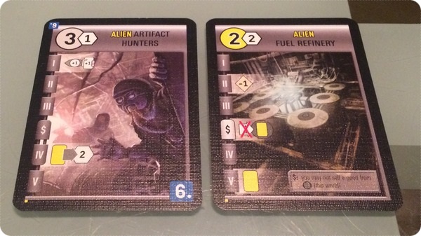 Второй раз играли исключительно в Alien Artefacts. Я не слишком силён в дополнениях, пока ещё одно от другого не отличаю, так что могу сказать только одно, тут много карт с ключевым словом Alien. А ещё именно в этой партии мне очень-очень повело. Сначала стартовая рука получилась такой, что я мог производить жёлтый товар и продавать его за 4 очка, а чуть позже появилась возможность изводить 2 товара и обменивать их аж на 8 очков. Правда, выиграть мне это всё равно не помогло. Более опытный товарищ справился с моим везением и занял первое место, а мне из троих игроков пришлось довольствоваться вторым.