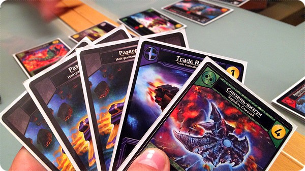 Дальнейший ход событий предсказать нетрудно. Я быстро избавился от стартовых карточек и попутно затаривался чем получалось. В основном мне везло, я покупал достаточно дорогие базы и очень редко брал корабли. Зато какие! Флагман Торговой федерации (5 атаки, возьмите карту и союзное свойство лечения), Лунный червь слизней (8 атаки, возьмите карту и союзное свойство, позволяющее поднять из торгового ряда в руку карту стоимостью 1 или 2).
