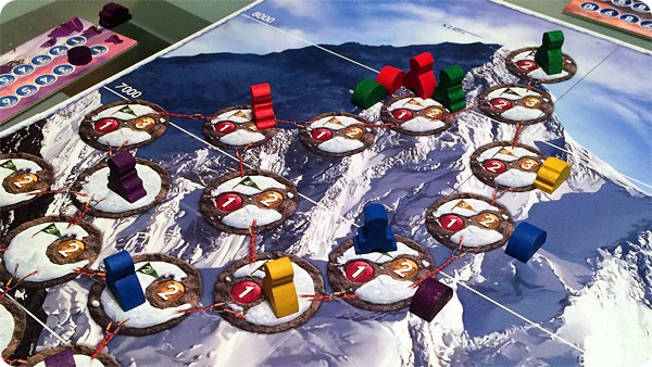 Двигаться им предстоит по полю с изображением горы, разделённым на локации. Перемещение выполняется при помощи карточек с очками движения. Чем ближе к вершине, тем двигаться труднее, да и другие альпинисты мешаются, на горе места не так много, иногда приходится ждать пока тебе не освободят проход.