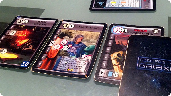 В Race for the Galaxy играли в первые три допа, без Alien Artefacts. Мне в самом начале пришёл "Контактёр", и я решил попробовать сыграть в "освоение", выложить максимум ценных миров, как мирных, так и военных.