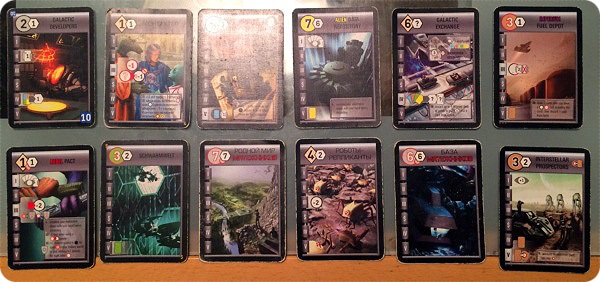 Вскоре в руку попалась карта Alien Data Repository, дающая жёлтый товар и позволяющая при поиске оставлять пришедшие карты и скидывать взамен карты из руки. Я построил её четвёртой на столе, то есть почти в самом начале, и получил хороший старт. Затем была "шестёрка" Galactic Exchange, дающая очки за разноцветные миры, которая и предопределила дальнейшее развитие. Я сыграл коричневый, а потом и зелёный миры. Синий к тому времени у меня уже был.